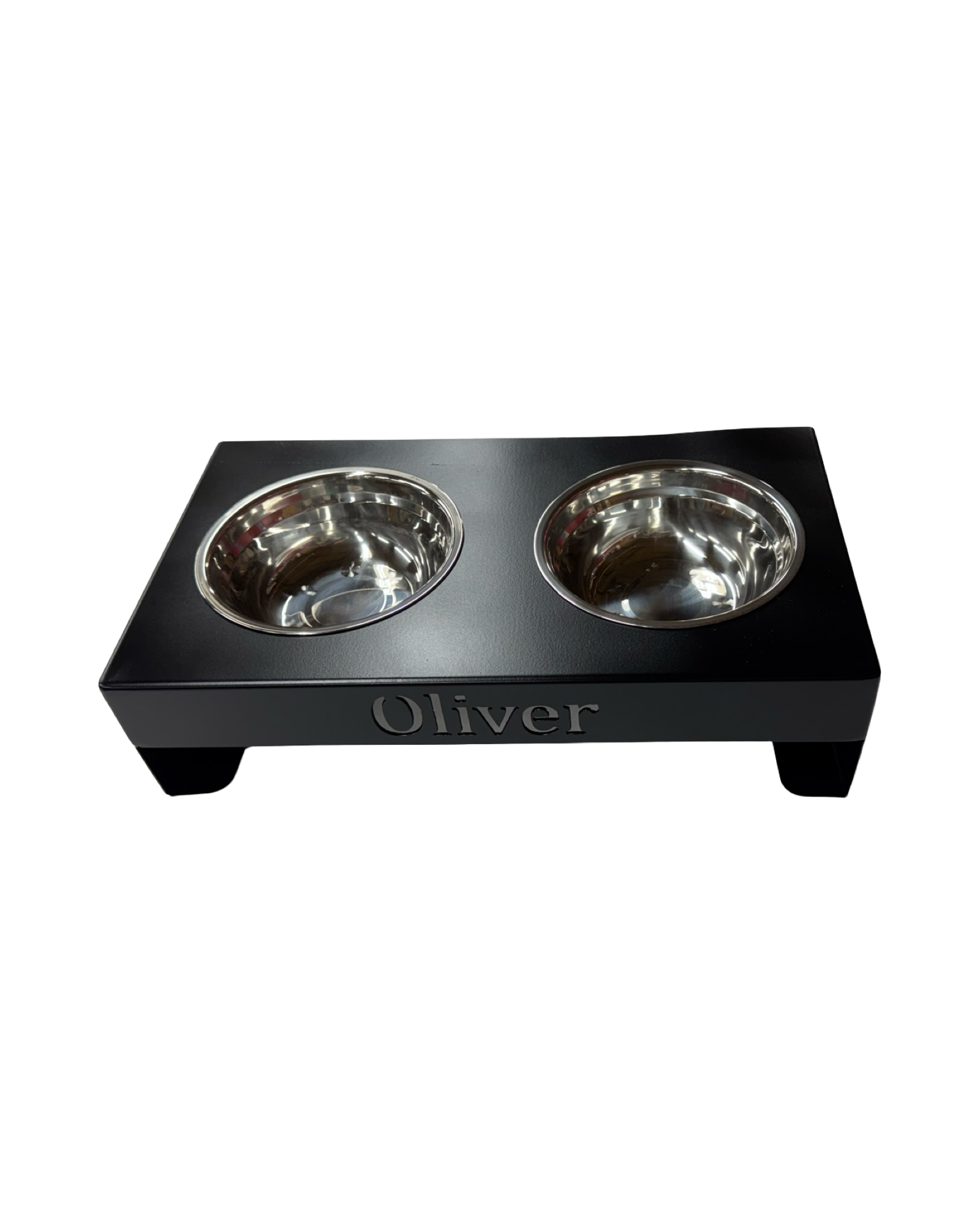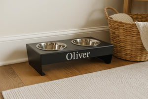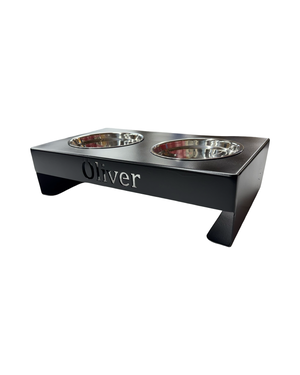 Available in three sizes, it comes with two high-quality stainless steel bowls and non-slip rubber feet to keep the stand securely in place on any floor. Personalize it with one or two pet names, laser-cut directly into the metal for a sleek, permanent finish that won’t peel or fade.