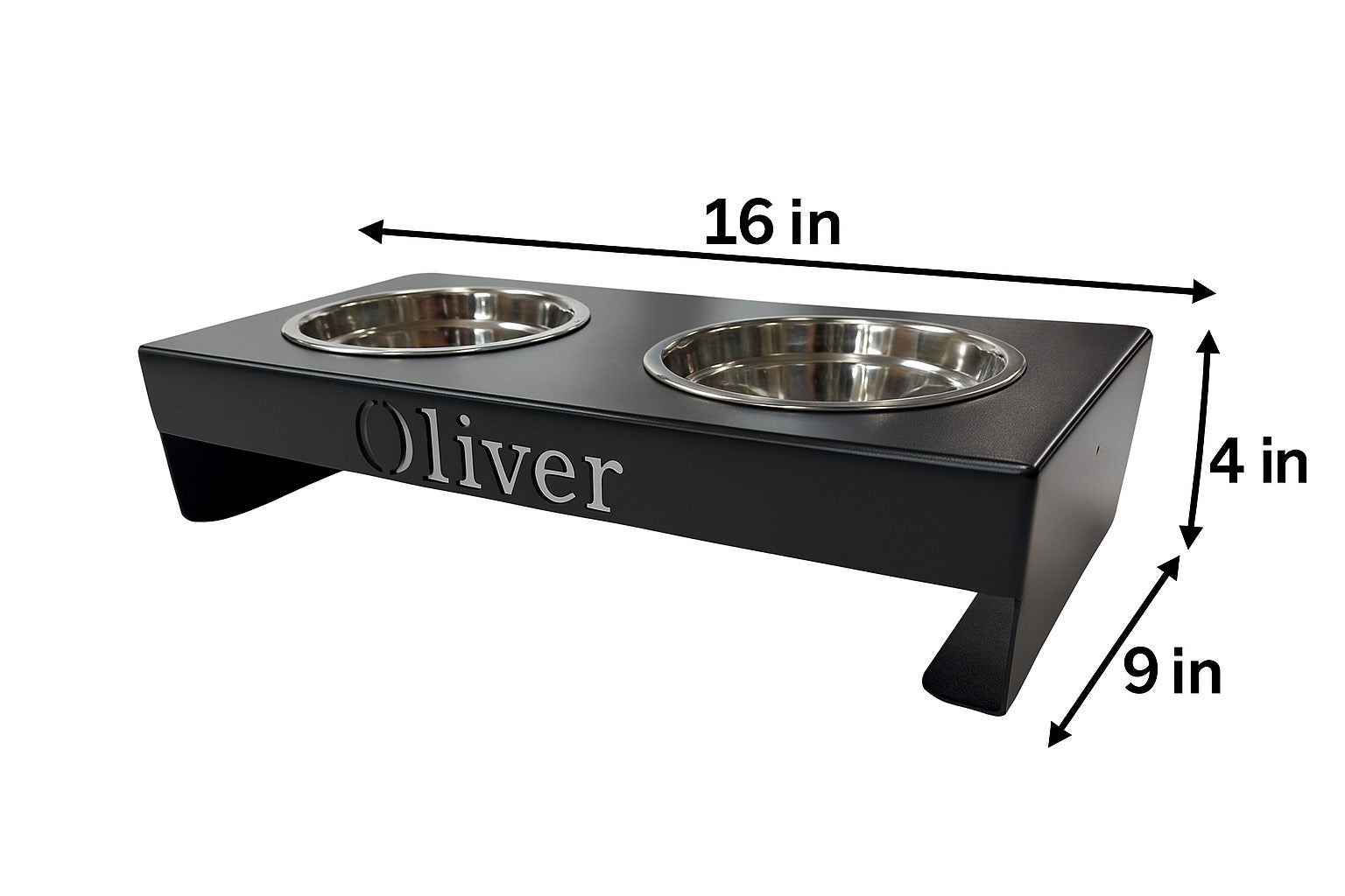 "Custom Black Metal Dog Bowl Stand – Personalized Raised Feeder with 1 or 2 Names in 3 Sizes"